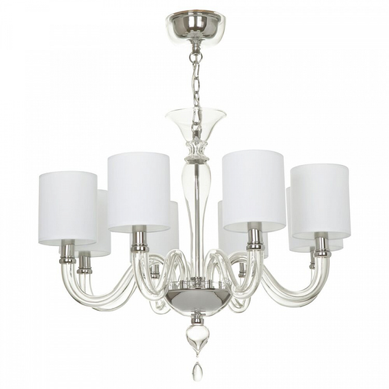 Арматура из металла и прозрачного стекла. Абажур из ПВХ покрыт белой тканью.