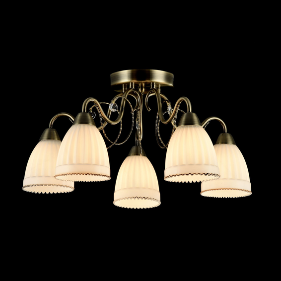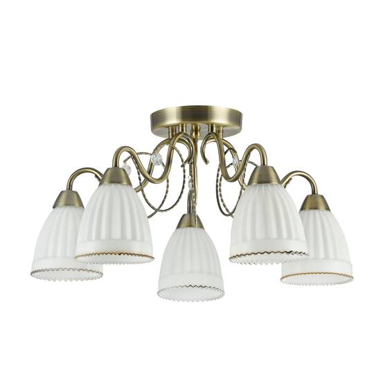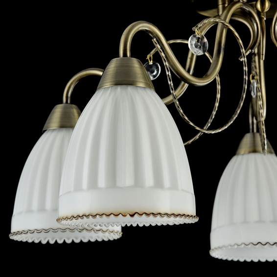 Арматура изделий выполнена из металла и выкрашена в бронзовый цвет. Абажуры из матового стекла. Также светильники украшены подвесками. Небольшая высота светильников серии позволяет использовать их для любых помещений, даже с невысокими потолками.