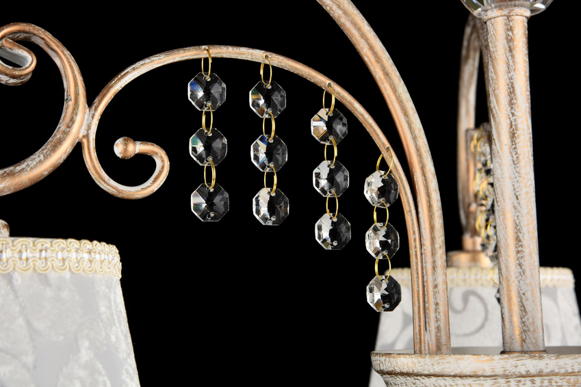 Белые абажуры из велюра с молочным рисунком. Дугообразные завитые декоративные элементы украшены прозрачными стеклянными бусинами. Отделка абажура - белое золото.