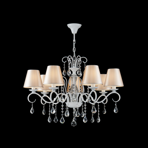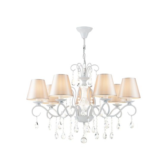 Центральная часть из прозрачного стекла придает белой металлической арматуре воздушности, а подвески из кристаллов усиливают этот эффект. Абажуры сделаны из атласа на ПВХ.