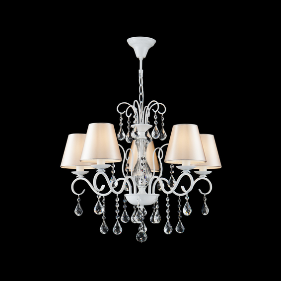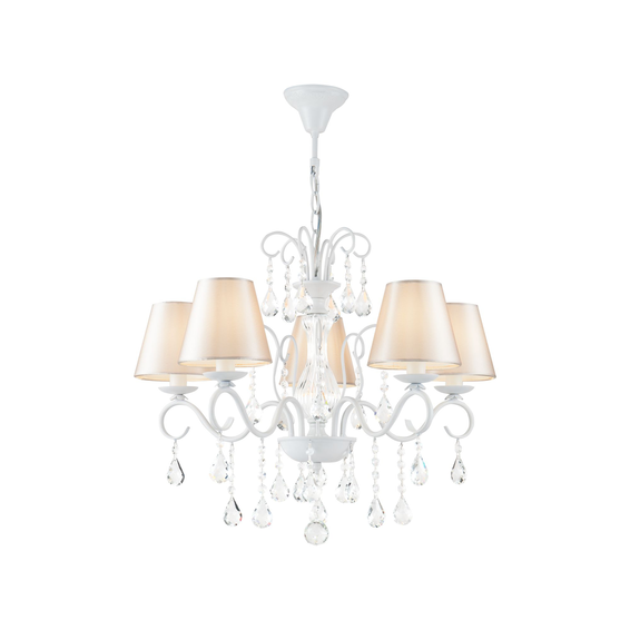 Центральная часть из прозрачного стекла придает белой металлической арматуре воздушности, а подвески из кристаллов усиливают этот эффект. Абажуры сделаны из атласа на ПВХ.