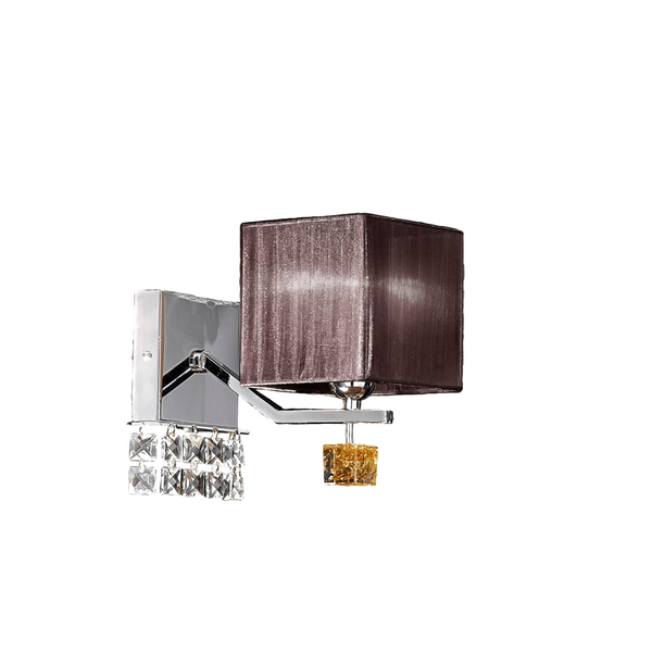 "Хромированная металлическая рама.Подвески из прозрачного хрусталя.Абажуры из органзы, доступны в черном, ледяном и медно-коричневом цветах.Кубики молотого хрусталя доступны в прозрачных, аметистовых и янтарных тонах. "