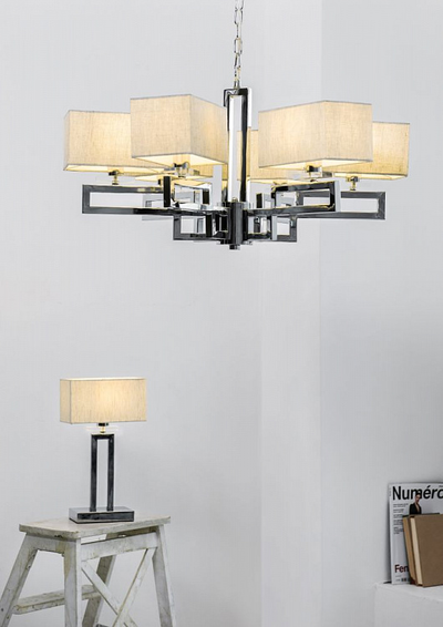 Арматура из металла. Прямоугольные абажуры из ПВХ покрыты льняной тканью.