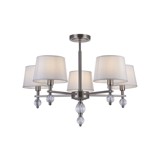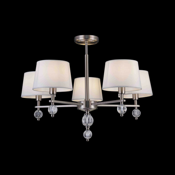 Арматура из метала цвета “никель” дополнена декоративными элементами из прозрачного акрила (шарики). Белые абажуры из текстиля на ПВХ.