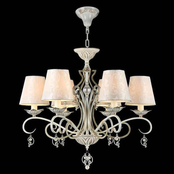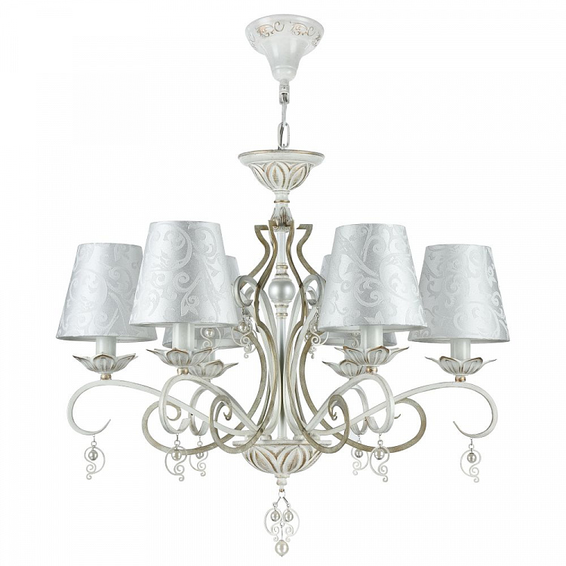 Арматура из металла. Декоративные элементы: жемчужина в основании и подвесках. Абажур из ПВХ покрыт тканью c узором.