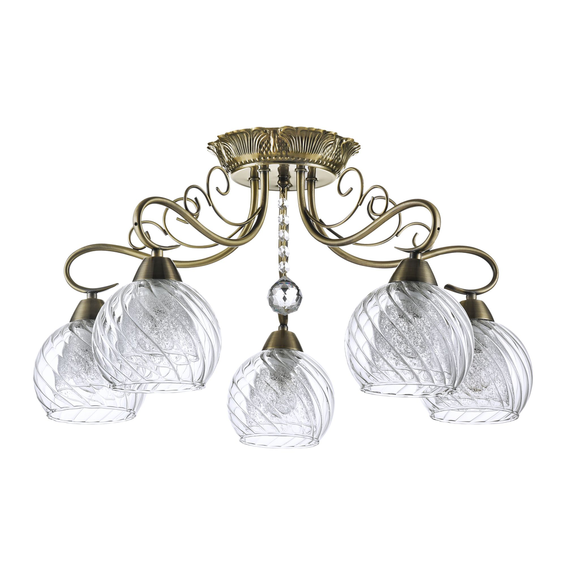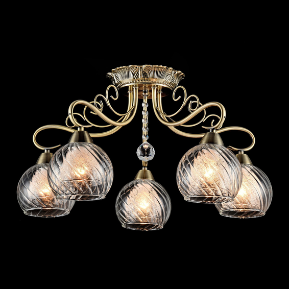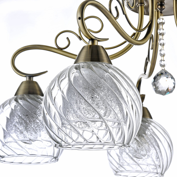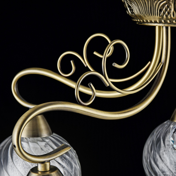 Арматура светильников сделана из металла бронзового цвета и причудливо изогнута (дань классическому стилю), а также декорирована кристаллами. Двойные плафоны из стекла разных обработок.