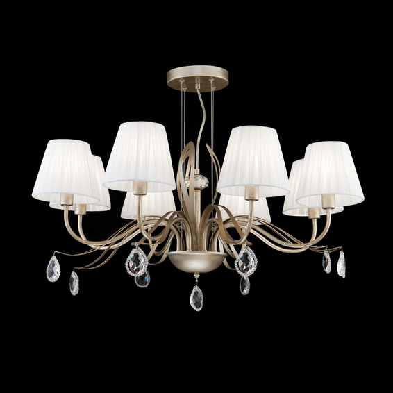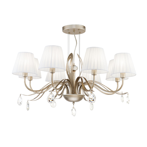 Арматура цвета античного серебра сделана из металла. Абажуры выполнены из гипюровой ленты белого цвета. Светильники крепятся на тросах. Завершающий штрих в дизайне светильников - декоративные составные подвески.