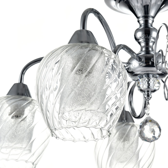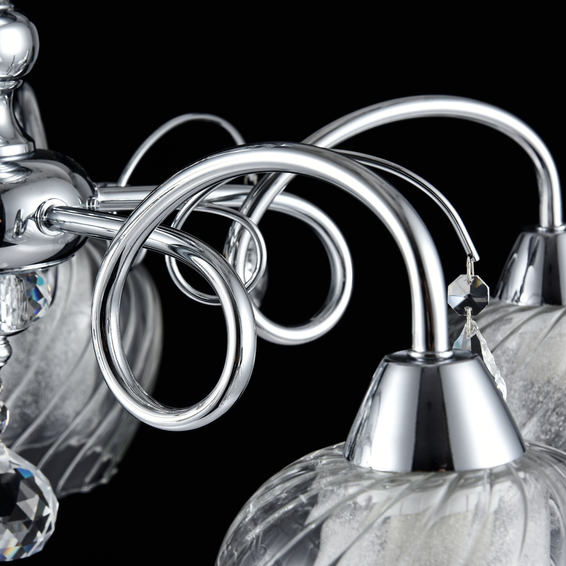 Арматура светильников выполнена из металла и украшена декоративными кристаллами. Изюминкой модели являются двойные плафоны, состоящие из внутреннего цилиндра и верхнего прозрачного стекла со спиральным рельефом.