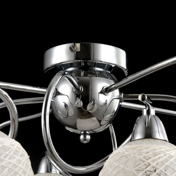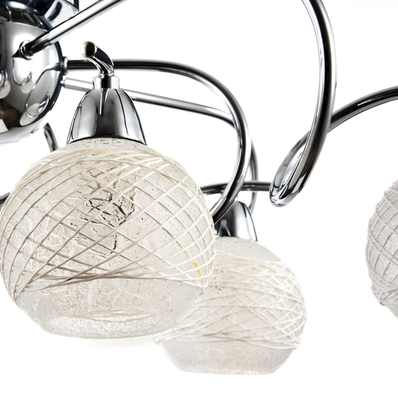 Плафоны, выполненные из фактурного стекла, украшены замысловатым плетением. Круглые плафоны светильников сочетаются с плавными линиями и изгибами металлической арматуры.