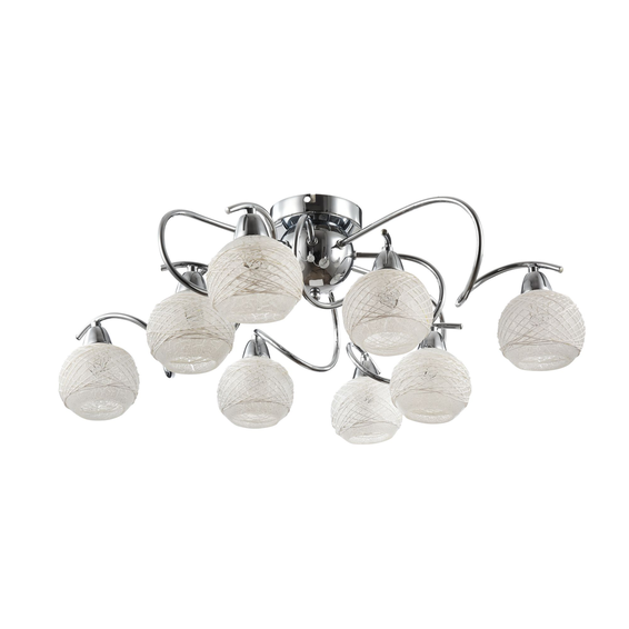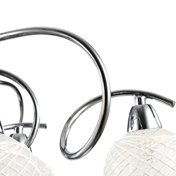 Декоративные плафоны, выполненные из фактурного стекла, украшены замысловатым плетением. Круглые плафоны светильников прекрасно сочетаются с плавными линиями и изгибами металлической арматуры. Светильники подходят для помещений с невысокими потолками.
