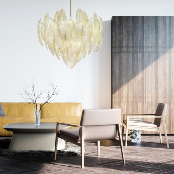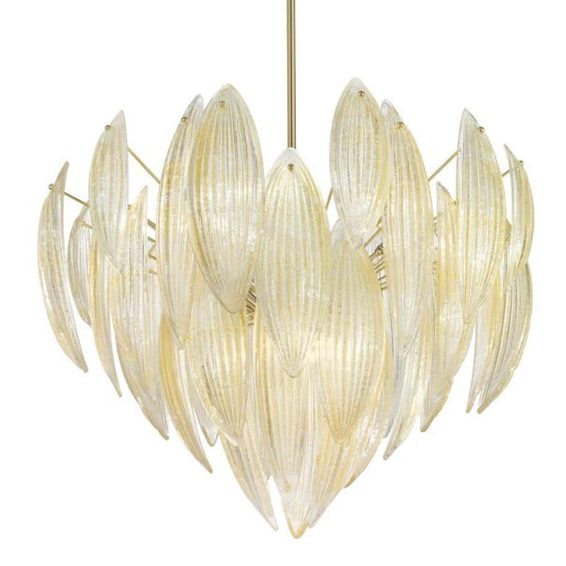 Каркас изготовлен из металла с декоративными элементами в виде лепестков из муранского стекла. Доступен в хроме и светлом золоте с муранским стеклом белого, прозрачного, бронзового, золотого и серебристого цвета.