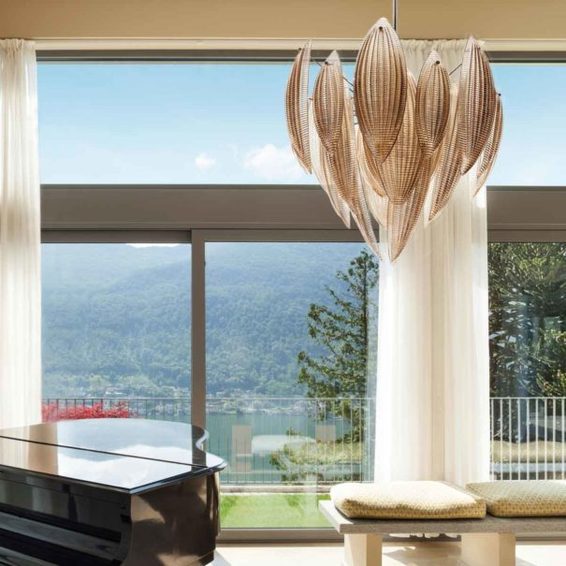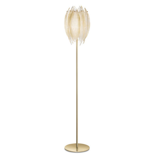 Каркас изготовлен из металла с декоративными элементами в виде лепестков из муранского стекла. Доступен в хроме и светлом золоте с муранским стеклом белого, прозрачного, бронзового, золотого и серебристого цвета.