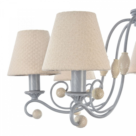 Арматура из металла украшена декоративными элементами из полирезина. Абажур из ПВХ покрыт рельефной тканью.