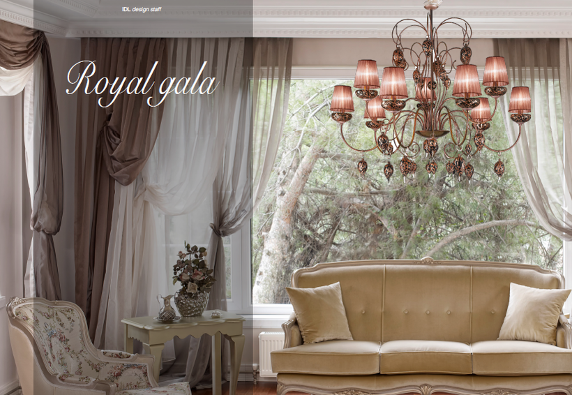 Каркас изготовлен из металла, чашки и подвески из муранского стекла, абажуры из органзы. Доступен в отделке из светлого золота в сочетании с муранским стеклом и органзой цвета слоновой кости, декорирация подвесками в цвете античное золото; металл в темной бронзе, чашки из муранского стекла черного цвета, абажуры из коричневой органзы.
