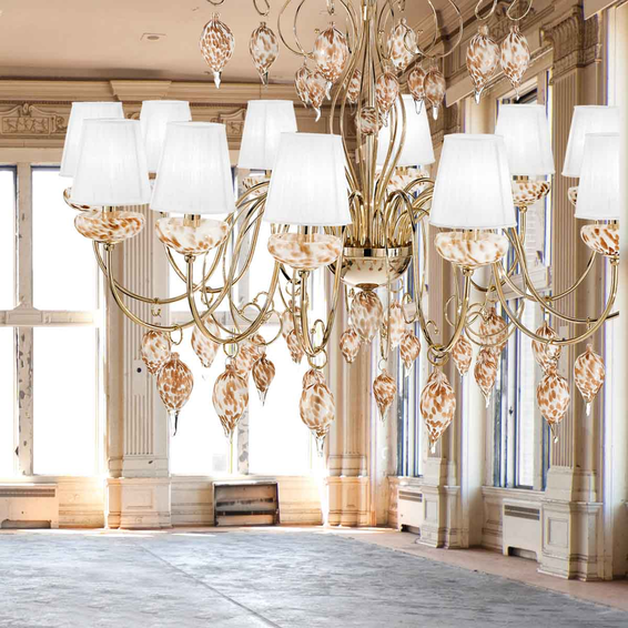Каркас изготовлен из металла, чашки и подвески из муранского стекла, абажуры из органзы. Доступен в отделке из светлого золота в сочетании с муранским стеклом и органзой цвета слоновой кости, декорирация подвесками в цвете античное золото; металл в темной бронзе, чашки из муранского стекла черного цвета, абажуры из коричневой органзы.