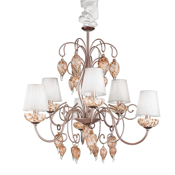 Каркас изготовлен из металла, чашки и подвески из муранского стекла, абажуры из органзы.