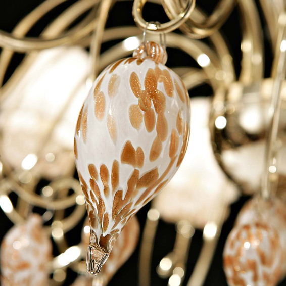 Каркас изготовлен из металла, чашки и подвески из муранского стекла, абажуры из органзы. Доступен в отделке из светлого золота в сочетании с муранским стеклом и органзой цвета слоновой кости, декорирация подвесками в цвете античное золото; металл в темной бронзе, чашки из муранского стекла черного цвета, абажуры из коричневой органзы.