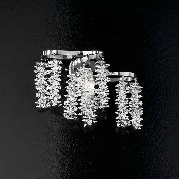 "Каркас из металла хромированного или легкого золота.Подвески из прозрачного хрусталя. Блокировка цилиндрических корпусов диффузора, из атласа Pyrex.Настольная лампа и основание торшера из атласного никеля."