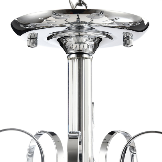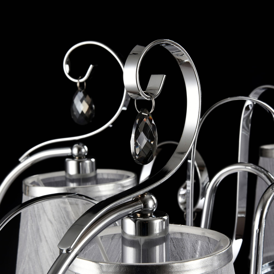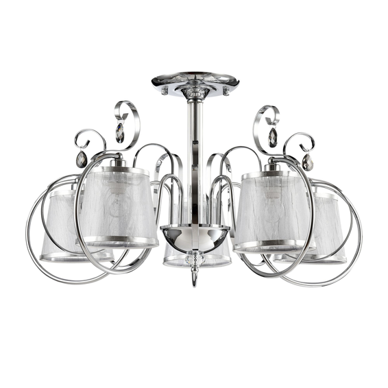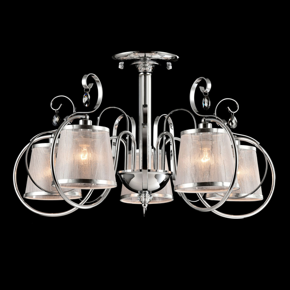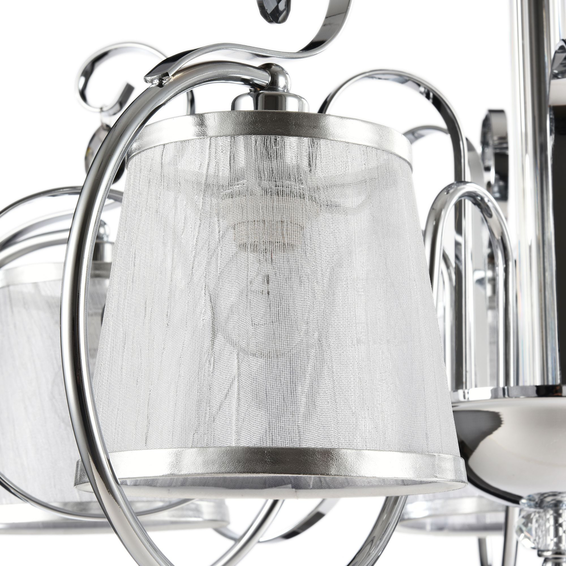 Арматура цвета «античное серебро», абажуры из органзы на ПВХ. Люстры подходят для помещений с невысокими потолками благодаря конструкции «2 в 1». Дизайн изделий дополнен декоративными подвесками.
