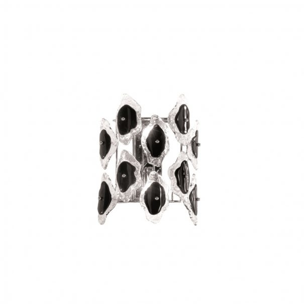 Каркас из металла хромированного или легкого золота.Светильник декорирован муранским стеклом разного цвета:прозрачный черный декорированный,прозрачный белый декорированный,прозрачный золтой декорированный.