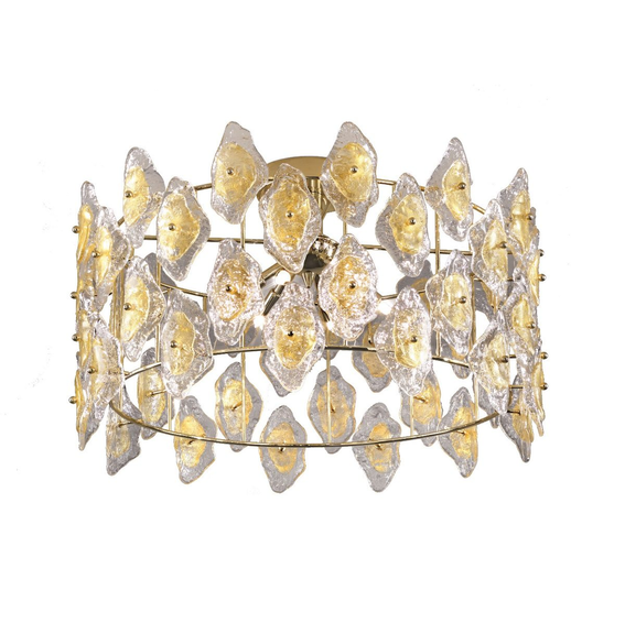 Каркас из металла хромированного или легкого золота.Светильник декорирован муранским стеклом разного цвета:прозрачный черный декорированный,прозрачный белый декорированный,прозрачный золтой декорированный.