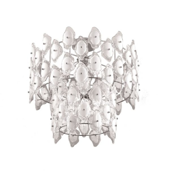 Каркас из металла хромированного или легкого золота.Светильник декорирован муранским стеклом разного цвета:прозрачный черный декорированный,прозрачный белый декорированный,прозрачный золтой декорированный.
