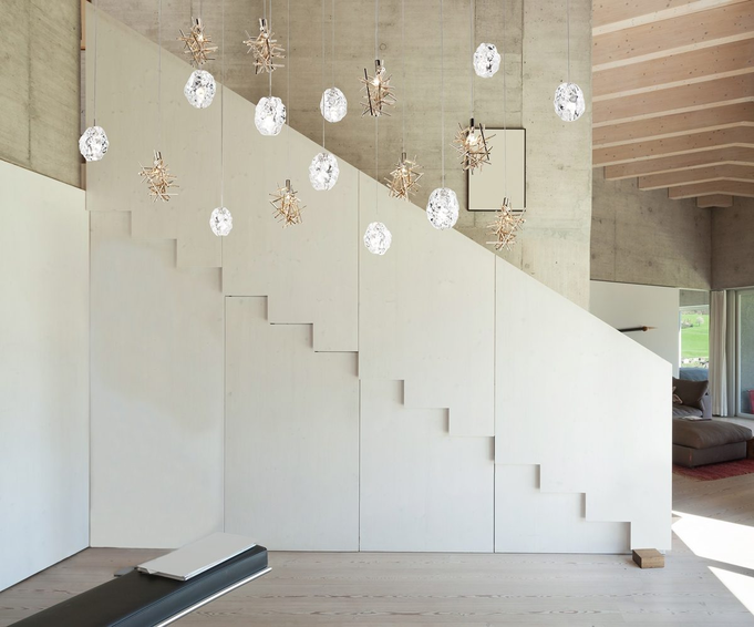 Каркас светильника доступен разных цветов.Диффузоры в прозрачном хрустальном стекле или в металле из чистой стали или светлого золота.