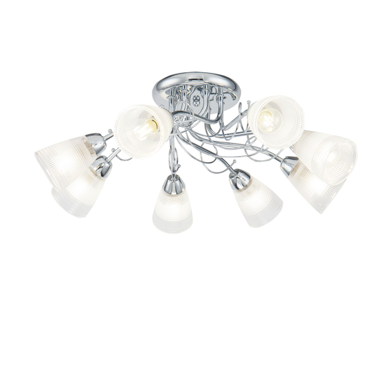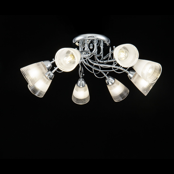 Блестящая арматура цвета «хром» сделана из металла, плафоны сделаны из прозрачного рифленого стекла.