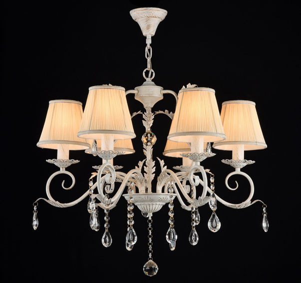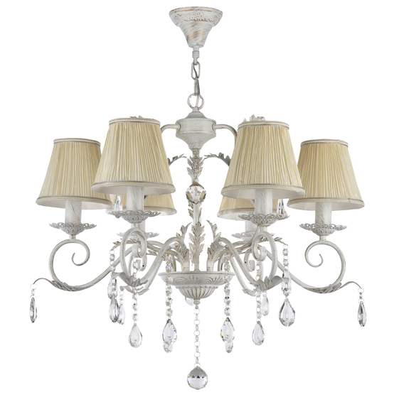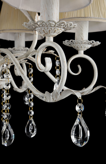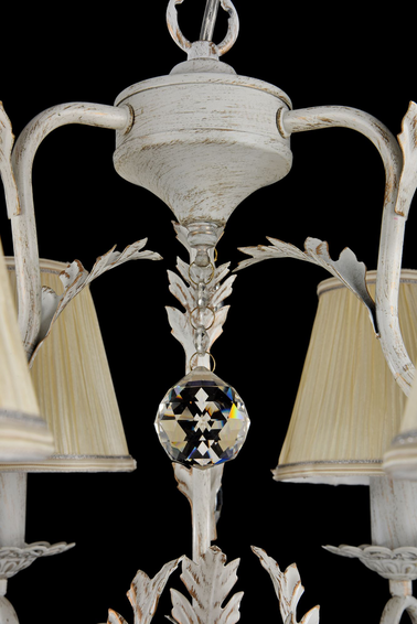 Потолочная чаша с цветочным орнаментом, золотое патинирование, нанесенное кисточкой в виде мелких мазков. Плиссированные абажуры сделаны из органзы. Люстра украшена кристаллом в форме шара в основании и подвесками.
