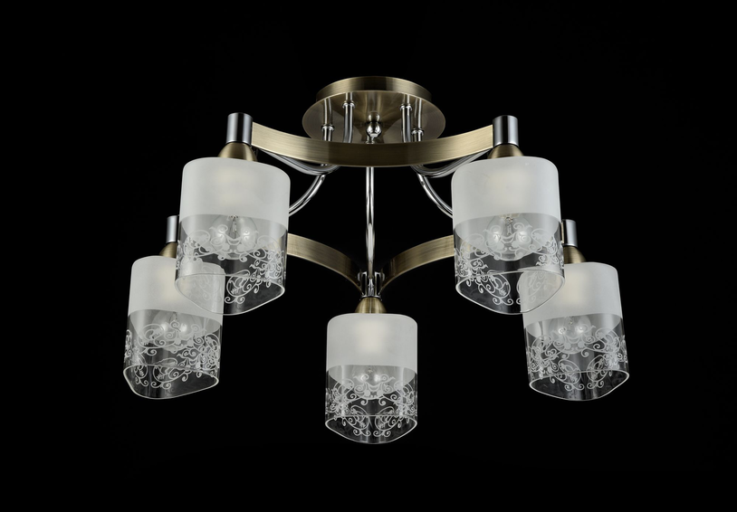 Арматура из металла бронзового цвета. Плафоны сделаны из двух видов стекла: из прозрачного и матового, с пескоструйным рисунком.
