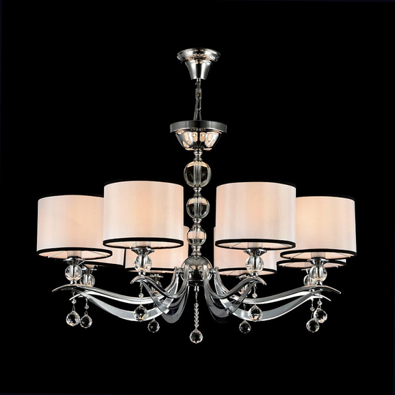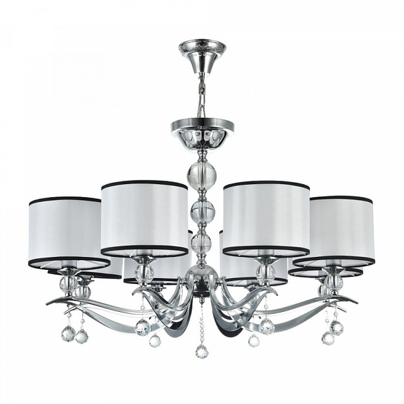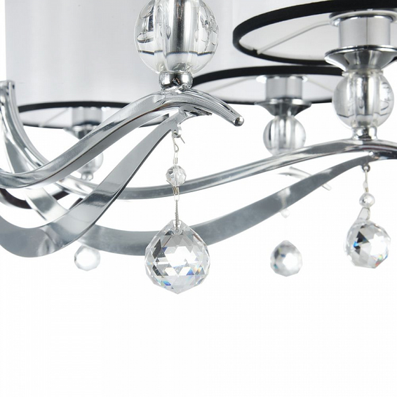 Арматура из металла. Центральная часть люстры декорирована стеклянными шарами и элементами из металла. Абажур из ПВХ покрыт белой тканью с черной тесьмой.