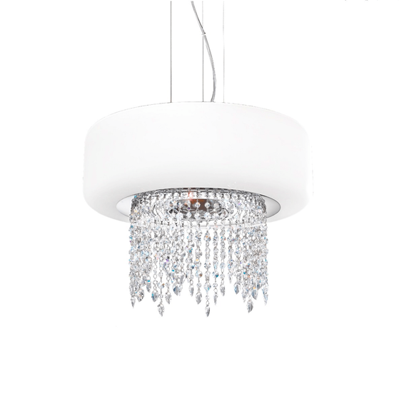 Рама и детали из хромированного металла.Молочно-белый рассеиватель из дутого стекла триплекс с кислотным травлением.Подвески хрустальные SWAROVSKI.