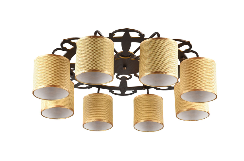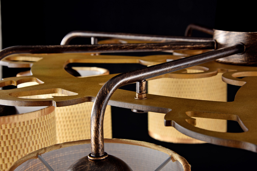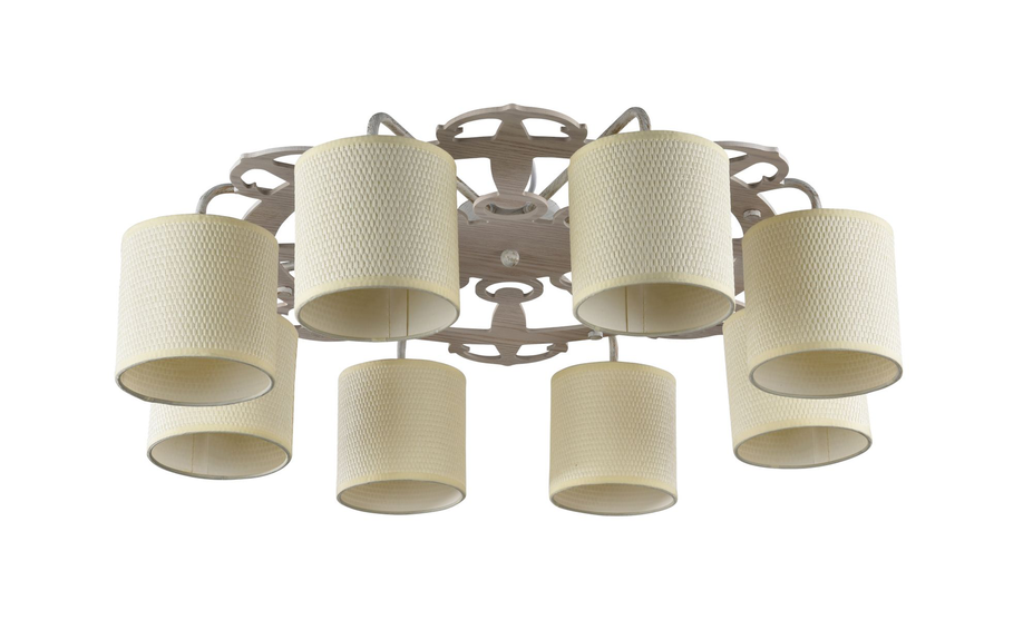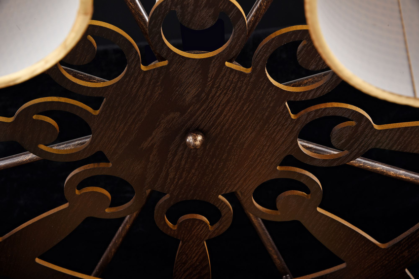 Круглый каркас у основания люстры,на котором крепятся рожки,сделан из дерева,а светло-бежевые абажуры имеют фактуру ротанга (рогожка).