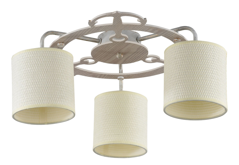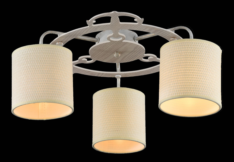 Круглый каркас у основания люстры,на котором крепятся рожки,сделан из дерева,а светло-бежевые абажуры имеют фактуру ротанга (рогожка).