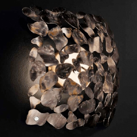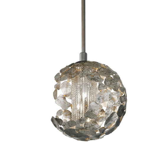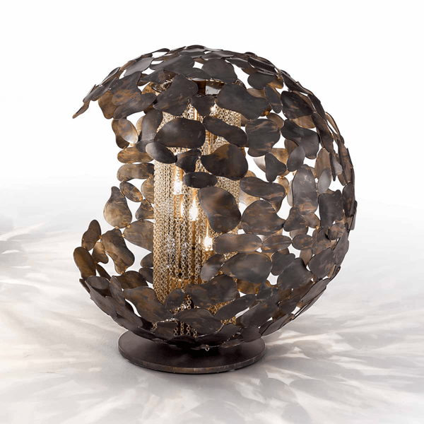 Каркас светильника доступен разных цветов:серебристый кортен с хромированными цепями, коричневый кортен с цепочками из светлого золота.