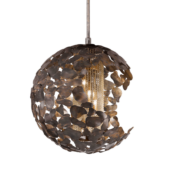 Каркас светильника доступен разных цветов:серебристый кортен с хромированными цепями, коричневый кортен с цепочками из светлого золота.