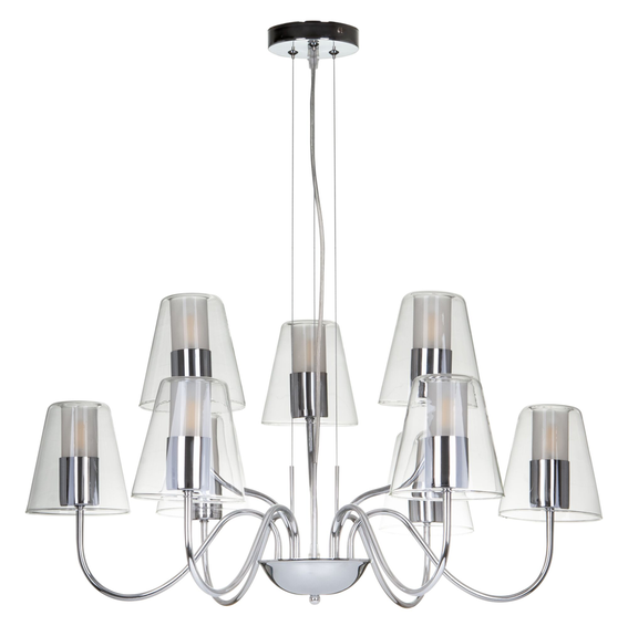Арматура сделана из металла цвета хрома. Плафоны в форме конусов выполнены из стекла, причем внутренняя часть - матовая, а внешняя - прозрачная. Благодаря своему необычному дизайну светильники словно парят в воздухе. Серия состоит из люстр на 9, 7 и 5 рожков и бра.