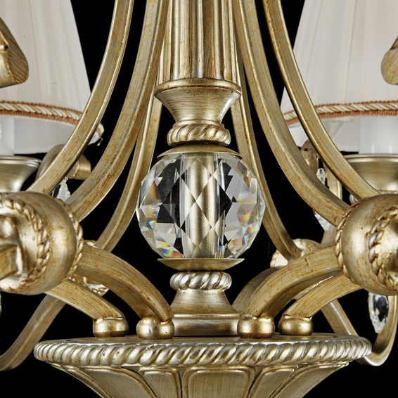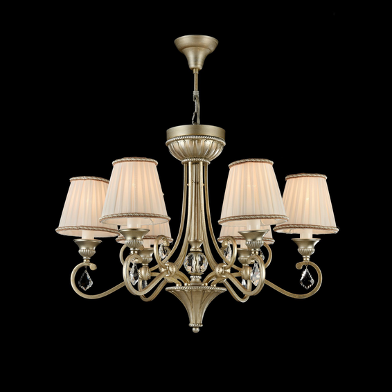 Арматура из металла. Множество декоративных элементов. Абажур из атласа обрамлен тесьмой. Подвески из *хрусталя.