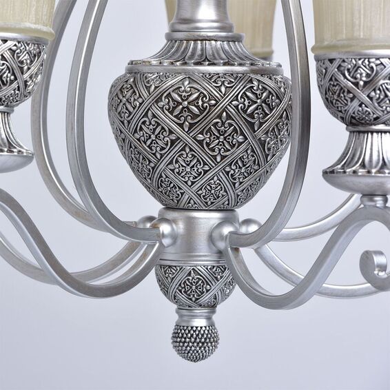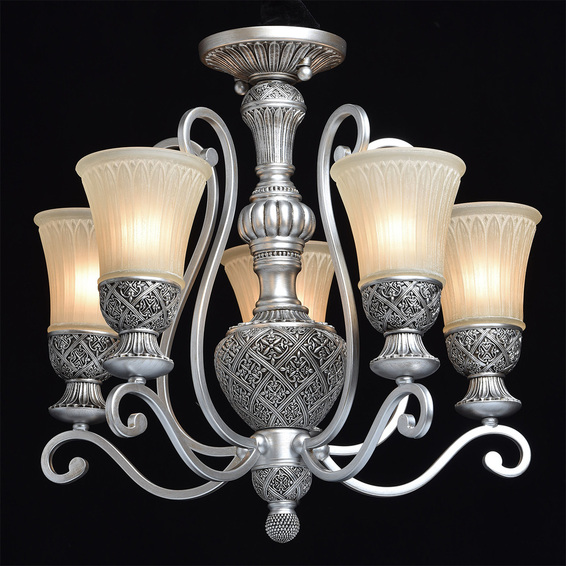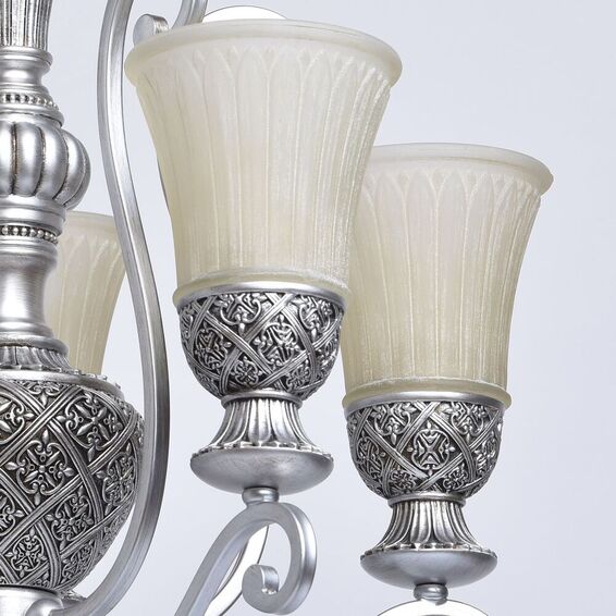 Кованое металлическое основание цвета античного серебра немецкой люстры Chiaro Версаче напоминает формами узорный сосуд, разливающий живительный свет через пять стеклянных плафонов-бокалов, который несёт уют ,тепло и пробуждение