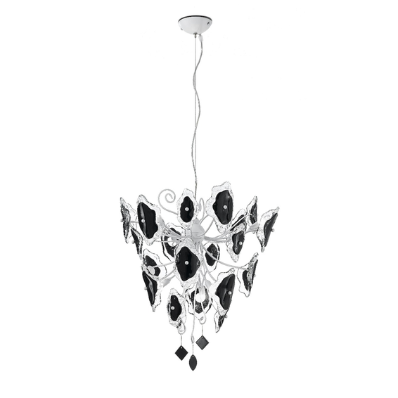 Каркас светильнмика из белого матового металла.Светильник декорирован муранским стеклом разного цвета:прозрачный черный с подвесками из черного стекла,прозрачный белый с стеклянными и подвесками белого цвета.