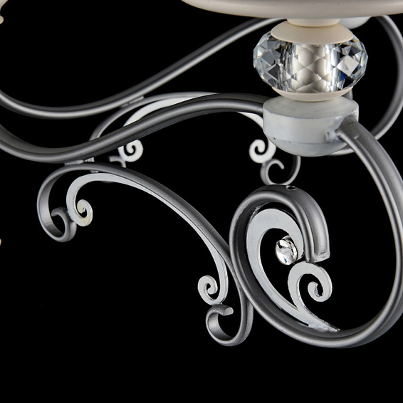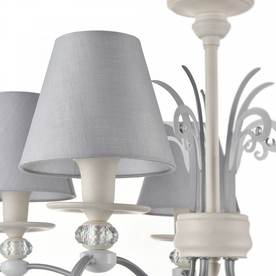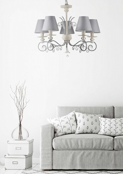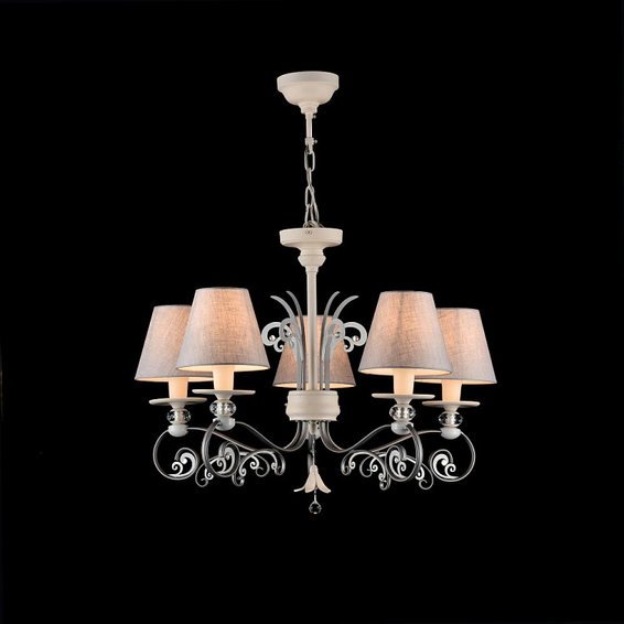 Арматура из металла. Рожки и основание люстры изготовлены по трафарету. Абажур из ПВХ покрыт серой тканью