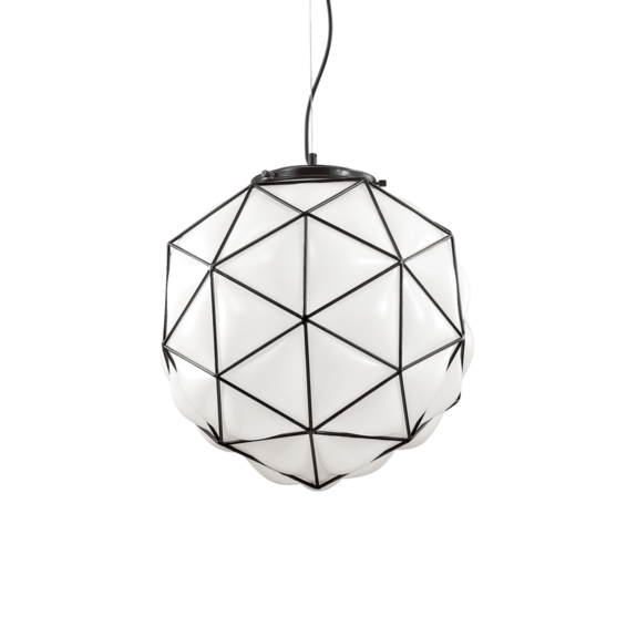 Потолочная чаша и арматура клеткой из металла окрашена чёрной матовой краской. Рассеиватель из белого дутого стекла ручной работы