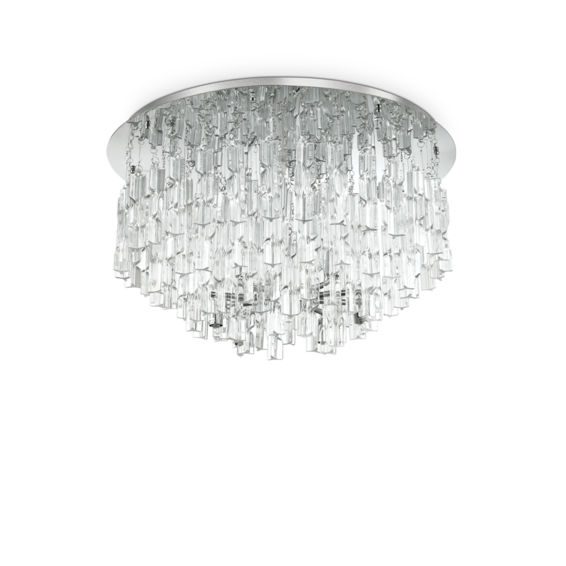 Круглая арматура из хромированного металла. Декоративные элементы из трубчатого стекла выгнуты вручную и закреплены зажимами к металлическим тросикам.