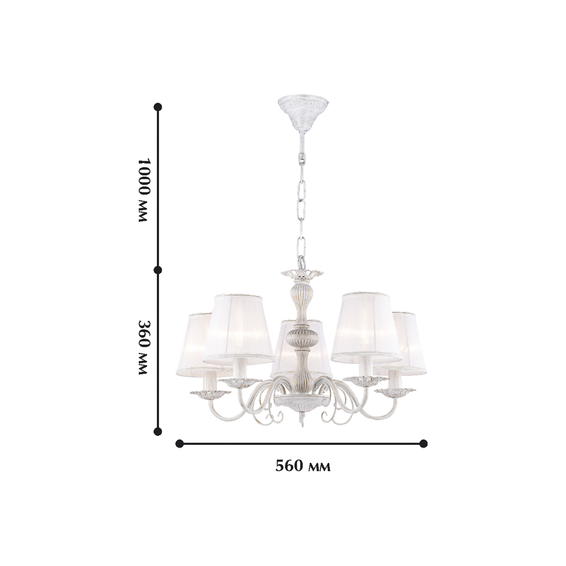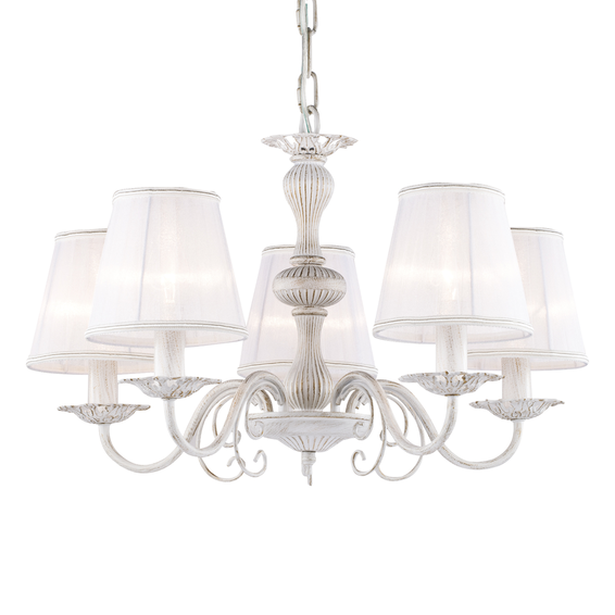 Каркас изготовлен из металла, окрашенного в белый цвет с золотой патиной, тканевый абажур из белой органзы, украшен белой тесьмой.