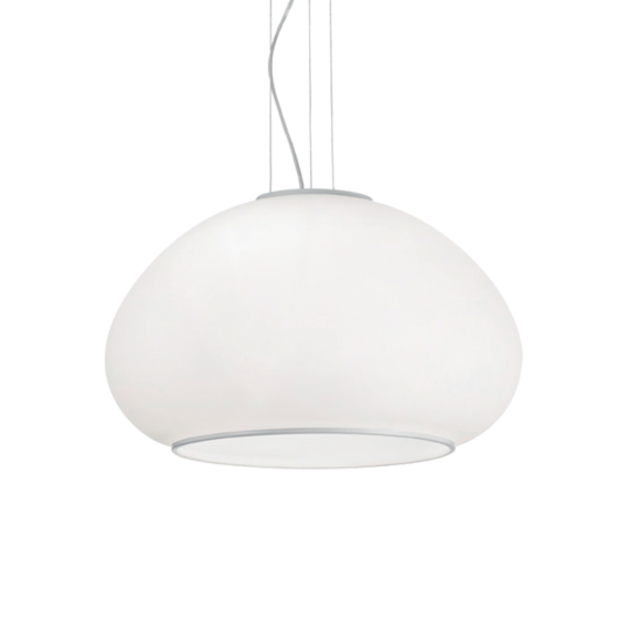 Арматура и кольцо на нижнем ободе из металла покрыты белой матовой краской. Рассеиватель из белого дутого матового стекла. Стальные тросики регулируемые по длине с помощью автоматического устройства.