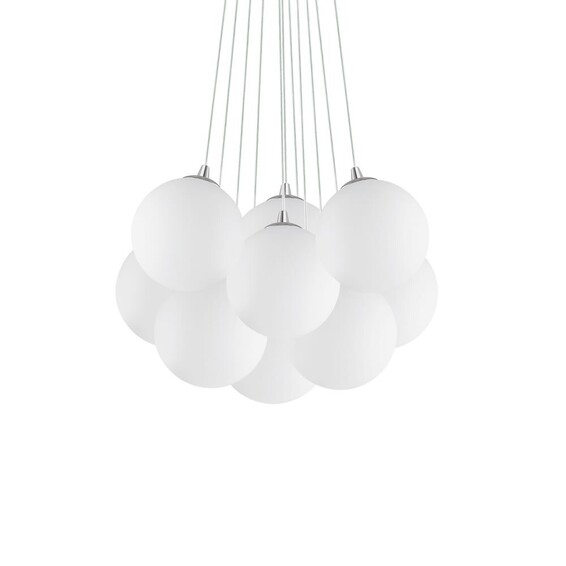 Арматура из металла. Шарообразный рассеиватель из белого дутого матового стекла. Подвесы снабжены стальными тросиками регулируемыми с помощью автоматического устройства.