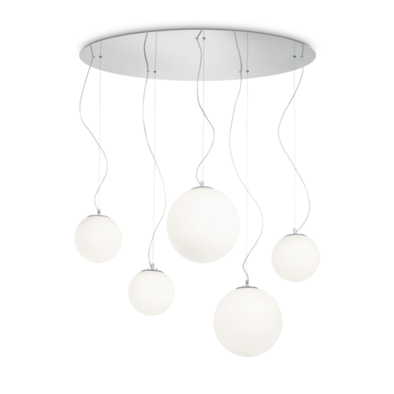 Арматура из металла. Шарообразный рассеиватель из белого дутого матового стекла. Подвесы снабжены стальными тросиками регулируемыми с помощью автоматического устройства.