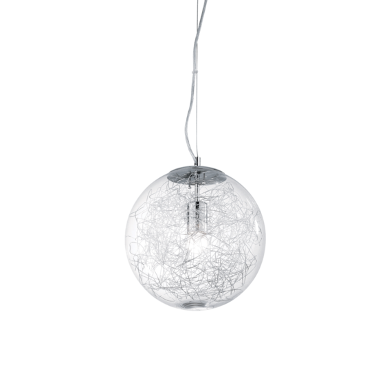 Арматура из хромированного металла. Рассеиватель из дутого стекла с внутренними декорациями в виде алюминиевой нити. Подвесы снабжены стальными тросиками регулируемыми с помощью автоматического устройства.