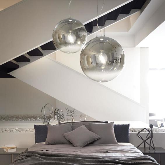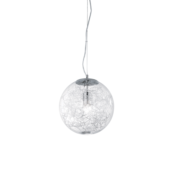 Арматура из хромированного металла. Рассеиватель из дутого стекла с внутренними декорациями в виде алюминиевой нити. Подвесы снабжены стальными тросиками регулируемыми с помощью автоматического устройства.