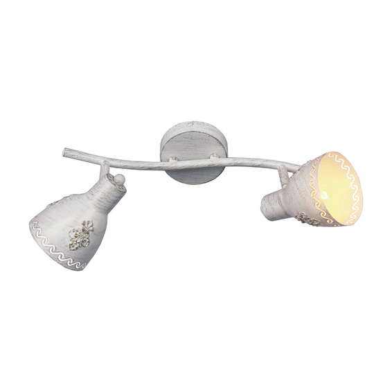 Каркас изготовлен из металла белого цвета с золотой патиной, плафон также из металла с ажурной окантовкой.